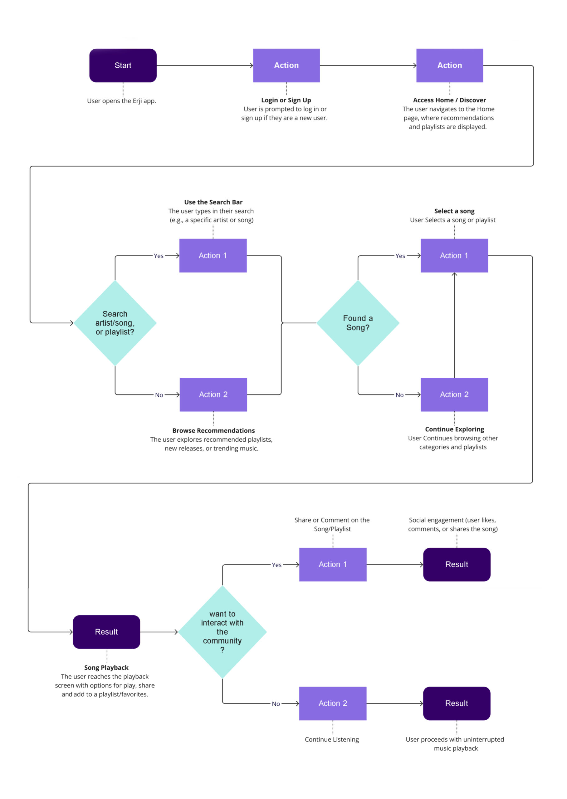 I created the User Flow diagram to visually map the user’s journey within the Erji app, clarifying each step and decision. It ensures intuitive navigation, aligns with user needs, and helps identify key interaction points. The flow guides the design, aids in communication with stakeholders, and supports development and testing for a seamless user experience.